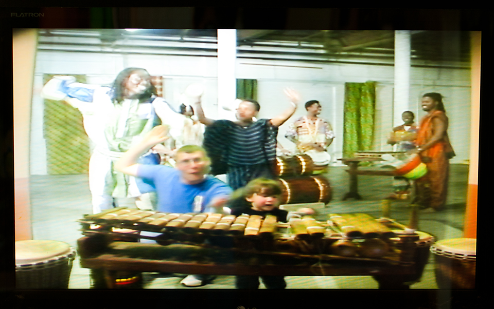 You can explore and climb inside Eddie, the 40-foot child exhibit. Here they are, three stories up, inside his head.